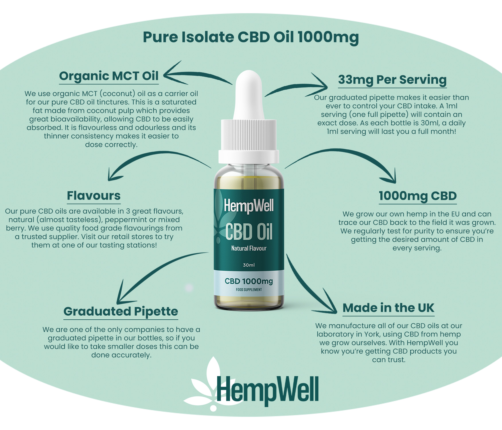 In our pure CBD oils, you’ll find our seed-to-shelf 99.9% CBD isolate. This is extracted in a GMP-certified facility using our hemp grown within the EU, using EU-certified seeds. This is mixed with filtered hemp seed oil and MCT oil to improve absorption by the body. We use top food-grade flavourings, which help to make the goodness all the more palatable. Interested in broad-spectrum CBD oils? Check out our broad spectrum range here.