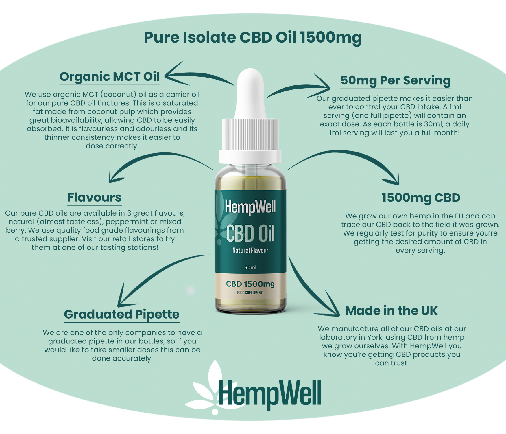 In our pure CBD oils, you’ll find our seed-to-shelf 99.9% CBD isolate. This is extracted in a GMP-certified facility using our hemp grown within the EU, using EU-certified seeds. This is mixed with filtered hemp seed oil and MCT oil to improve absorption by the body. We use top food-grade flavourings, which help to make the goodness all the more palatable. Interested in broad-spectrum CBD oils? Check out our broad spectrum range here.