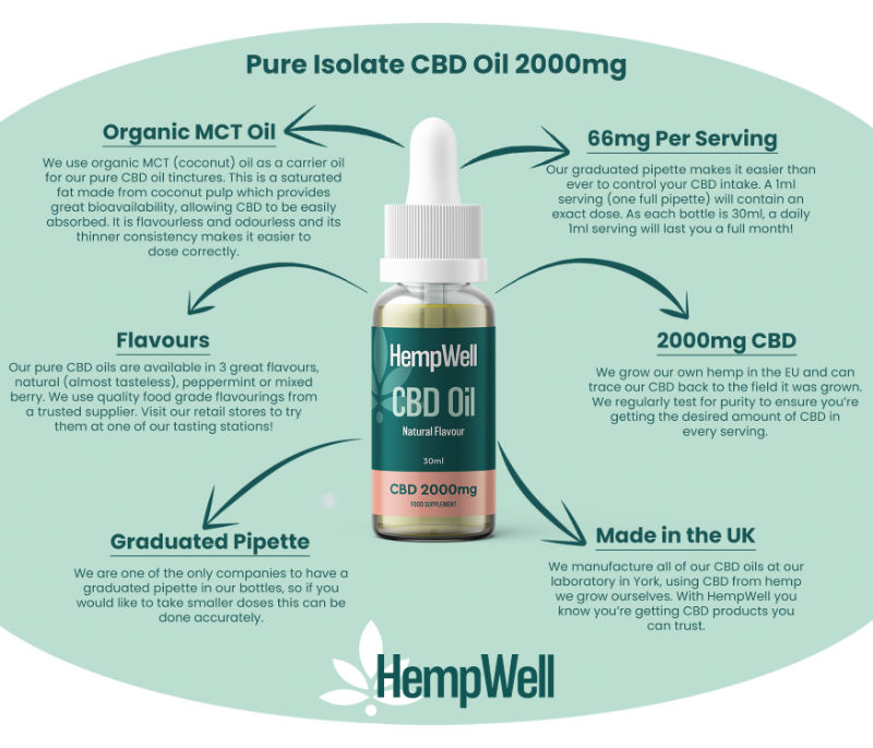 In our pure CBD oils, you’ll find our seed-to-shelf 99.9% CBD isolate. This is extracted in a GMP-certified facility using our hemp grown within the EU, using EU-certified seeds. This is mixed with filtered hemp seed oil and MCT oil to improve absorption by the body. We use top food-grade flavourings, which help to make the goodness all the more palatable. Interested in broad-spectrum CBD oils? Check out our broad spectrum range here.